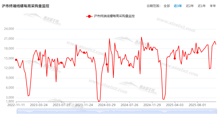 本期,西本资讯监测的沪市线螺周终端采购量为1.92万吨,周环比减少5.42%(见下图)。本周终端需求环比回落,显示刚需再次收缩。