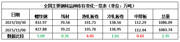 据西本资讯历史数据,当前库存总量较上年同期(2024年11月7的830.04万吨)增加253.70万吨,增幅为30.56%。分品种看,本期五大钢材品种库存中,热轧卷板和中厚板库存增加,其它品种降库。(见下图)