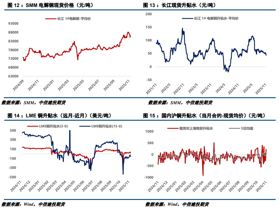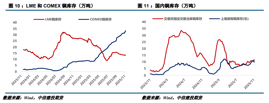价格回调尚未全面激活下游需求。产业方面,据印尼自由港10月下旬已重启运营Grasberg的Big Gossan矿和Deep Mill Level Zone矿,Block Cave矿区仍预计明年分段重启,该矿区金铜产量比重约70%。不过,嘉能可因环保升级与运营成本原因,计划逐步关停加拿大铜粗炼产能20万吨的炼厂,全球铜供应整体仍偏紧。受价格高位回调与终端企业年末促销影响,下游需求有所释放,国内现货升水低位反弹。库存方面,上周全球铜库存延续增至68.77万吨,其中上期所铜去库0.11万吨至11.5万吨,保税铜小幅去化0.48万吨至10.18万吨,LME铜累库0.23万吨至13.59万吨,COMEX铜累库1.4万吨至33.5万吨。