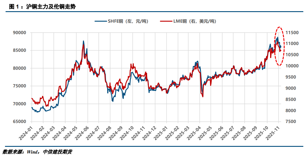 上周铜价高位回调为主,沪铜主力自8.7万元偏弱震荡运行至8.5万元附近,周跌幅约0.83%。LME铜自1.1万美金回调至1.06万美金附近,周跌幅约0.64%。上周铜价的回落主要与宏观利多兑现有关,包括中美关税风险减弱、国内政策预期落地,同时美国政府持续停摆、制造业PMI数据降温加剧了市场的担忧情绪,加之高价令下游采购意愿受抑,铜价承压回落为主。