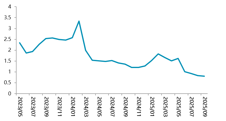 终端消费维持高增长,其中动力市场新能源汽车维持高速增长,乘联会数据显示,10月全国乘用车新能源市场零售140万辆,同比增长17%,渗透率达58.7%,出口市场持续突破,中国汽车世界份额稳步提升至38%;储能市场也是供需两旺,根据SMM数据,1-10月,国内储能电芯累计产量409.4GWh,同比增幅55.44%,同时储能电芯的库销比已经由2月份1.83的高位降至目前的0.8,供应持续偏紧。