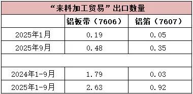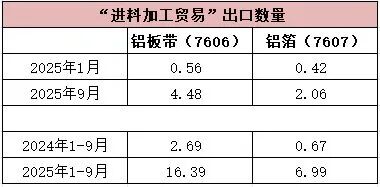 由表中数据可见,自铝材出口退税取消政策实施后,我国铝板带箔以“来料加工贸易”和“进料加工贸易”方式出口的数量均显著增长。其中,“进料加工贸易”出口量呈现激增态势:2025年1-9月,进料加工贸易出口铝板带数量达16.39万吨,累计同比增长508.66%;同期,进料加工贸易出口铝箔数量为6.99万吨,累计同比增长935.81%。