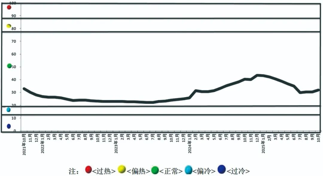 10月份,中国有色金属产业景气指数为31.8,较上月上升1.4个百分点,从总体来看,本月景气指数继续保持上升趋势,仍处在 “正常”区间中下部,具体情况见图1。