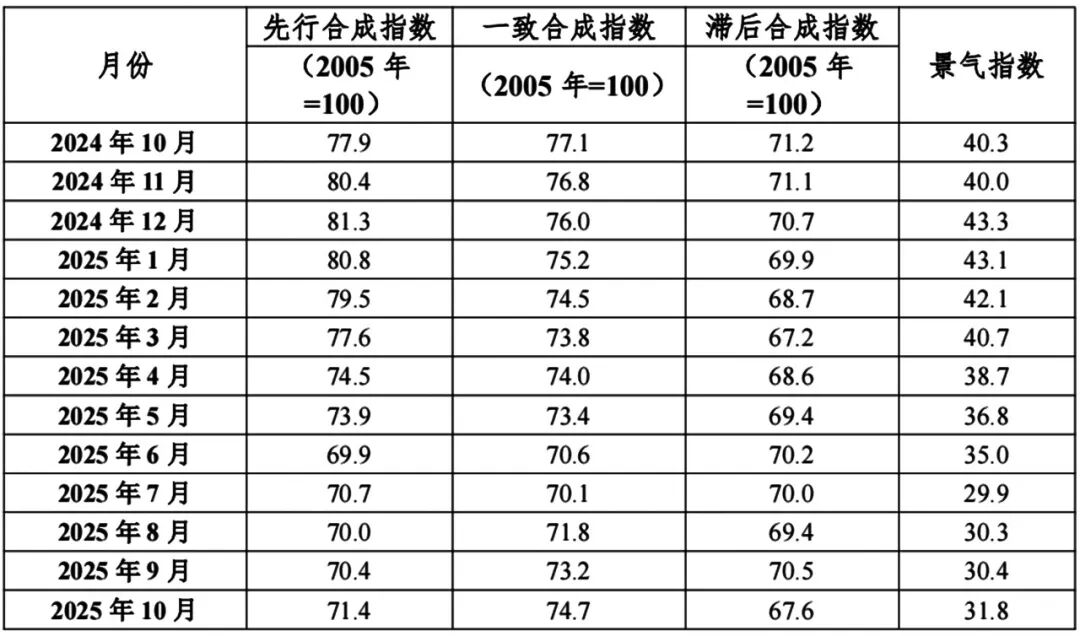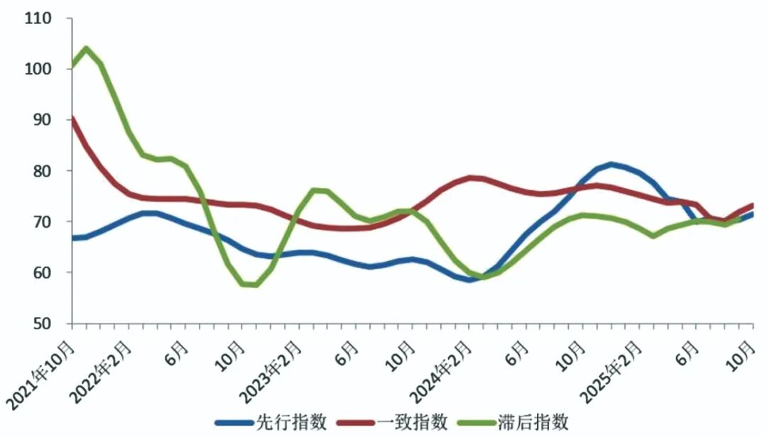 10月份,先行合成指数为71.4,较上月上升1.0个百分点。经季节调整后,同比出现上升的指标有5项,分别是LMEX指数、M2指数、汽车产量指数、有色金属固定资产投资额指数及有色金属进口额指数,同比分别增长1.2%、6.4%、3.2%、7.2%和5.9%;环比出现上升的指标也有4项,分别是汽车指数、商品房销售面积指数、家电组合及有色金属固定资产投资额指数,同比分别增长3.7%、0.4%、0.1%和1.8%。