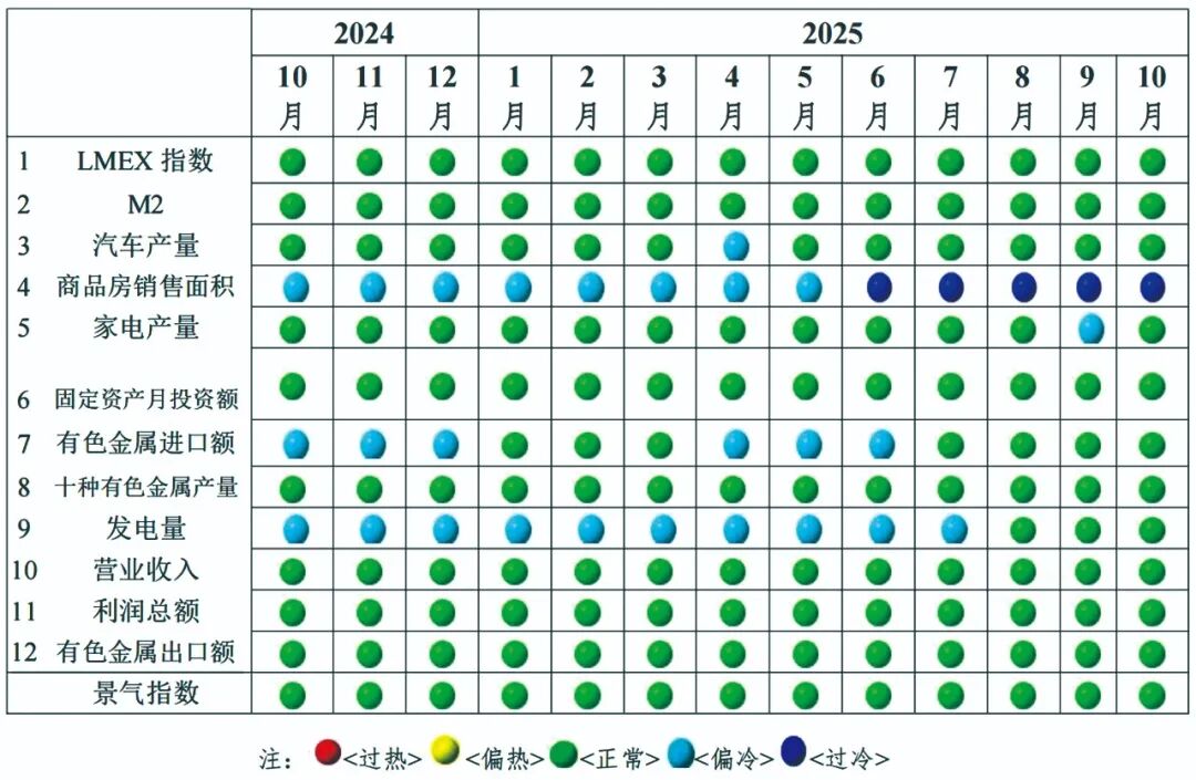在构成有色金属产业景气指数的12项指标中,LMEX指数、M2、汽车产量、家电产量、有色金属固定资产月投资额、有色金属进口额、十种常用有色金属产量、发电量、营业收入、利润总额及有色金属出口额等11项指标位于“正常”区间,仅商品房销售面积1项指标位于“过冷”区间。