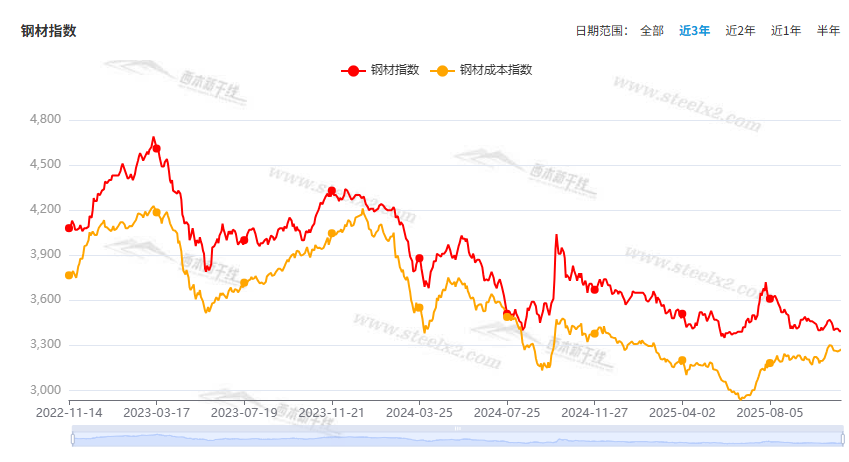 本期,全国各地市场建筑钢材价格小幅整理:其中,北方钢厂强势,稳中调高;南方期现联动,低位起落。本周西本钢材指数徘徊,成本指数趋高,显示长流程钢厂利润空间仍有压缩;本周螺纹钢期货主力合约低位波动,对现货有引导作用。(下图为红色线条为钢材指数,黄色线条为成本指数)