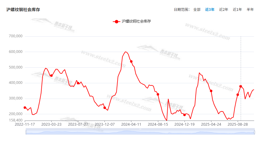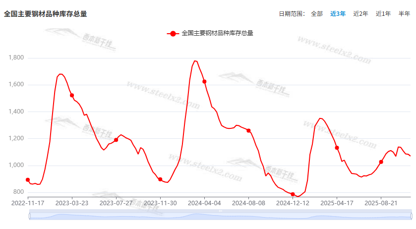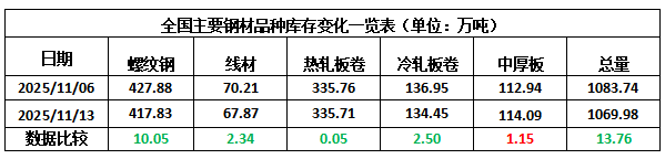 中钢协:2025年11月上旬,重点统计钢铁企业共生产粗钢1926万吨,平均日产192.6万吨,日产环比增长6.0%;生铁1804万吨,平均日产180.4万吨,日产环比增长3.5%;钢材1884万吨,平均日产188.4万吨,日产环比下降5.5%。11月上旬,重点统计钢铁企业钢材库存量1549万吨,环比上一旬增加86万吨,增长5.9%;比上月同旬减少39万吨,下降2.5%;比去年同旬增加183万吨,增长13.4%。