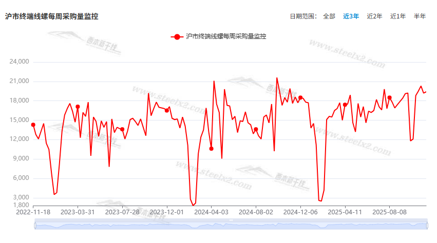 本期,西本资讯监测的沪市线螺周终端采购量为1.94万吨,周环比增加1.04%(见下图)。本周终端需求环比变化不大,显示刚需表现平缓。