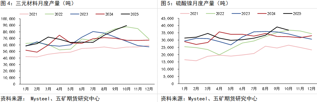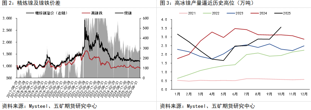 受新能源汽车的超预期增长,三元电池产量三季度表现亮眼,支撑硫酸镍需求。但从季节性来看,硫酸镍需求或已达年度高点。另外,2026年新能源汽车减免购置税政策取消,抢购效应下,2026年新能源汽车销量预计承压。若硫酸镍需求下滑,硫酸镍价格较精炼镍的溢价或出现大幅下跌,推动中间品流入精炼镍市场,加剧精炼镍的过剩预期。