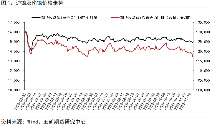 近期镍价无视有色板块的强势表现,向下突破前期震荡平台,沪镍主力合约一度逼近4月低点。截至11月14日,沪镍主力合约周五收报117080元/吨,跌幅达2.16%;伦镍周五报价14860美元/吨,周跌幅1.07%。