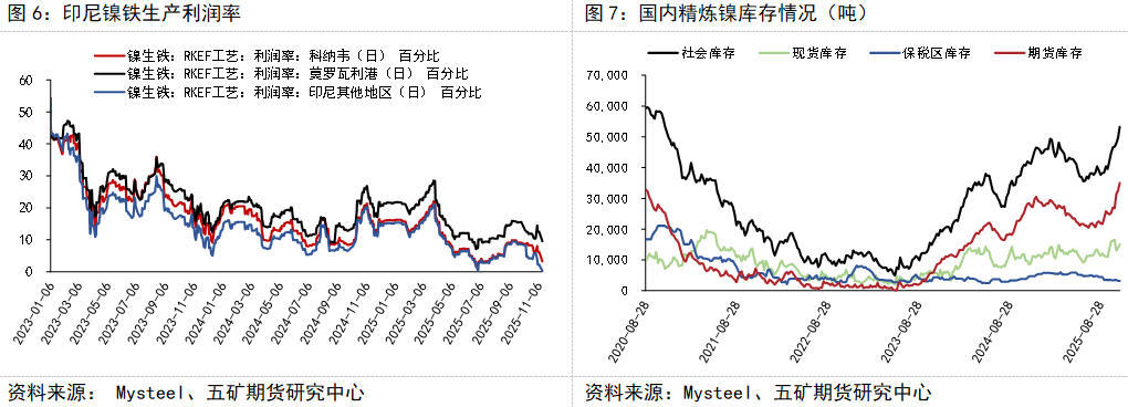 从成本端来看,当前镍铁利润水平已经处于绝对低位。根据最新镍铁价格测算,印尼镍铁生产利润率已基本为零,减产预期下,镍铁价格或已接近阶段性低点。基于这一判断,镍价的下跌空间也就仅限将精炼镍溢价打至低点,对应镍价115000元/吨附近。不过,我们仍不建议在这一位置抄底,一方面,火法矿价若受镍铁拖累出现下跌,或负反馈带动镍铁价格跌破900元/镍大关;另一方面,即使短期镍铁价格止跌,在需求弱势、库存高企的背景下,反弹力度也极为有限。
