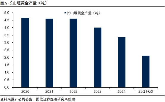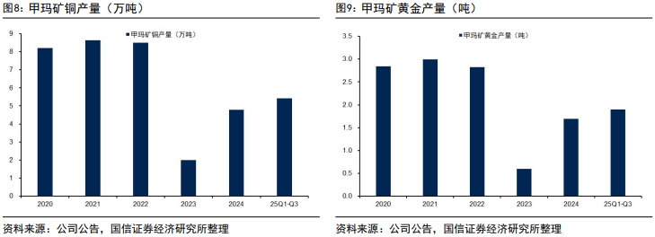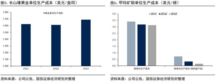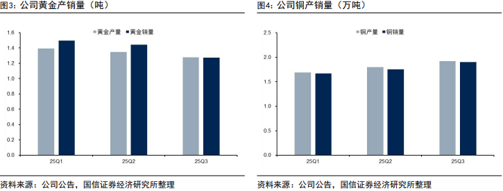 核心产品产销量数据方面:公司前三季度实现黄金产量4.02吨,Q1/Q2/Q3产量分别为1.39/1.35/1.28吨,前三季度实现黄金销量4.21吨,Q1/Q2/Q3销量分别为1.50/1.44/1.27吨。其中长山壕前三季度黄金产量约2.12吨,Q1/Q2/Q3产量分别为0.74/0.69/0.69吨,前三季度黄金销量约2.34吨,Q1/Q2/Q3销量分别为0.85/0.79/0.69吨;甲玛矿前三季度黄金产量约1.90吨,Q1/Q2/Q3产量分别为0.65/0.66/0.59吨,前三季度黄金销量约1.87吨,Q1/Q2/Q3销量分别为0.65/0.65/0.58吨。公司前三季度实现铜产量5.41万吨,Q1/Q2/Q3产量分别为1.69/1.80/1.92万吨,前三季度实现铜销量5.33万吨,Q1/Q2/Q3销量分别为1.67/1.76/1.90万吨。公司2025年产量指引:长山壕黄金产量指引约2.4-2.6吨,前三季度已完成指引的82%-88%;甲玛矿黄金产量指引约2.15-2.3吨,前三季度已完成指引的83%-89%,铜产量指引约6.3-6.7万吨,前三季度已完成指引的81%-86%。全年的维度来看,公司金、铜产量超过指引的可能性较高。