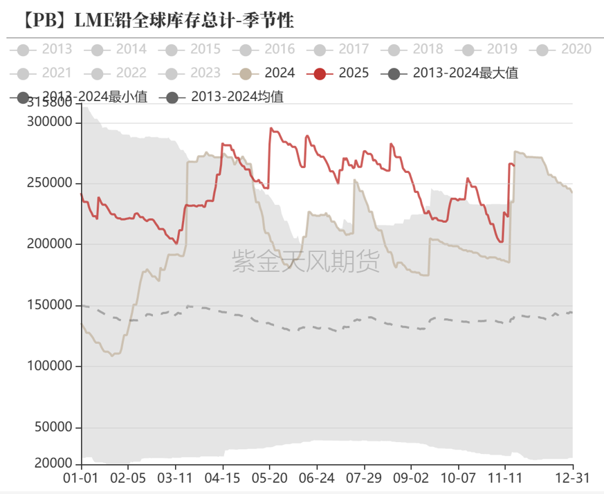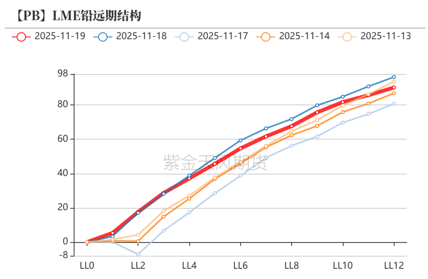 截至11月19日,LME铅锭库存总计报26.45万吨,环比累库3.9万吨,连续两周大幅累库。