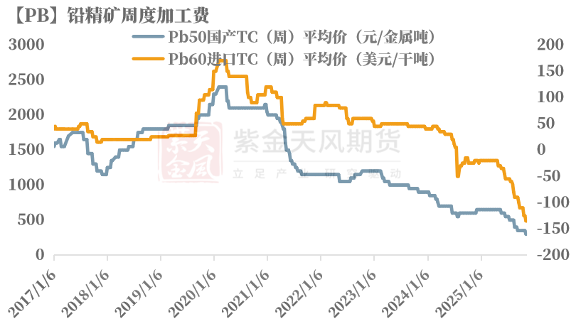 整体上,短期铅炼厂仍以追求副产品综合效益为主,仍有意向含银及小金属的铅精矿支付更低的加工费,部分26年长单TC已跌至-160~-200美元/干吨。