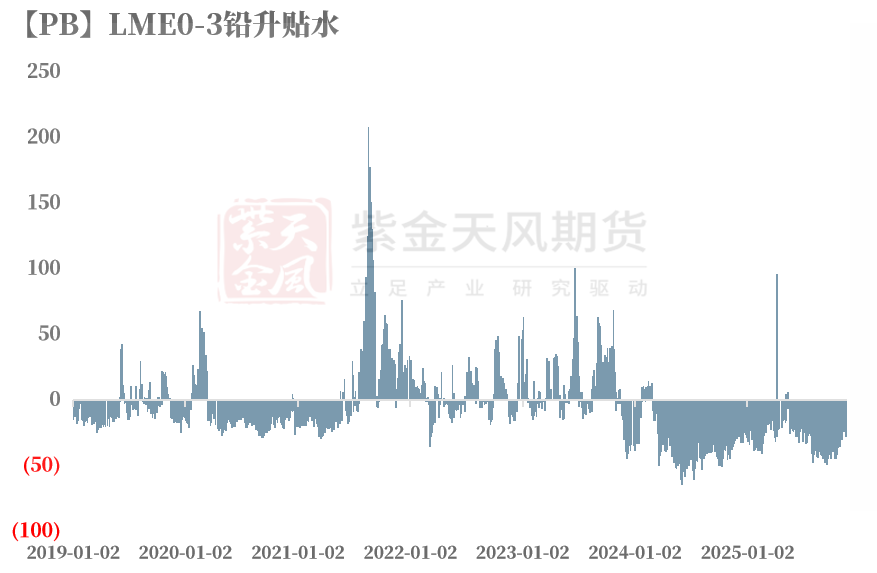 结构上看,外盘LME维持Contango结构,但近期LME铅0-3贴水呈现收窄趋势,周四在-27.39美金/吨。