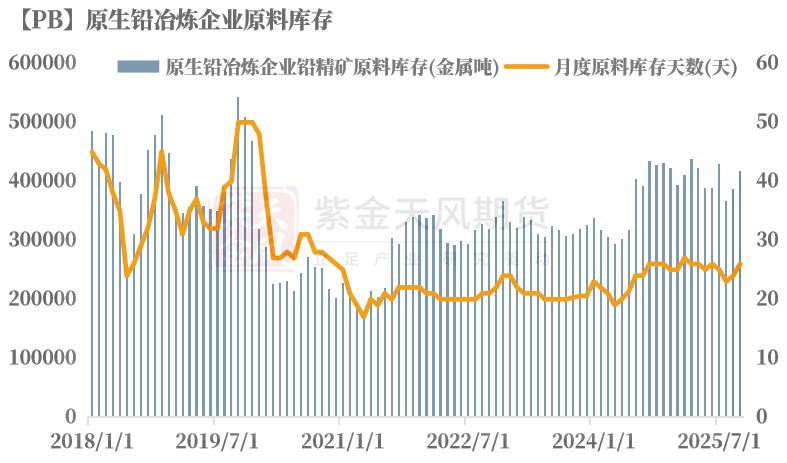 南方部分省份铅精矿相对紧缺,但10月原生铅炼厂原料库存天数26天,较9月上升2天,整体位于较高水平。