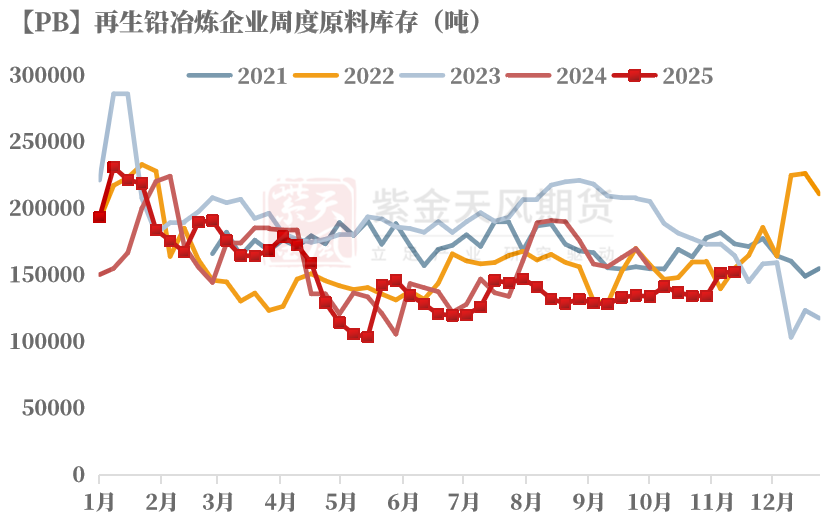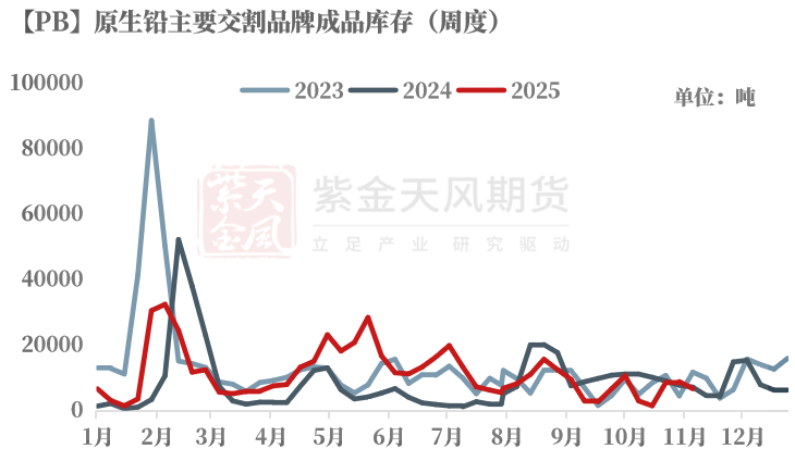 原生铅企业近期在副产品加持下利润迅速上升至300元/吨,逆转上月亏损状态;企业周度成品库存6700吨,整体维持低位水平。