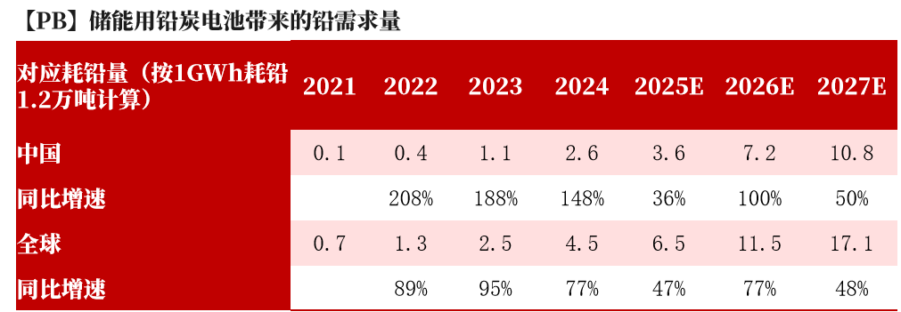 根据测算,铅炭电池因添加碳材料,铅占比略降,按1GWh需耗铅1.2万吨计算,2026年全球铅炭电池带来的铅需求增量将达5万吨;