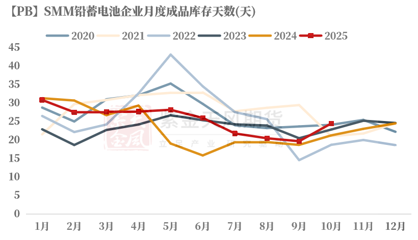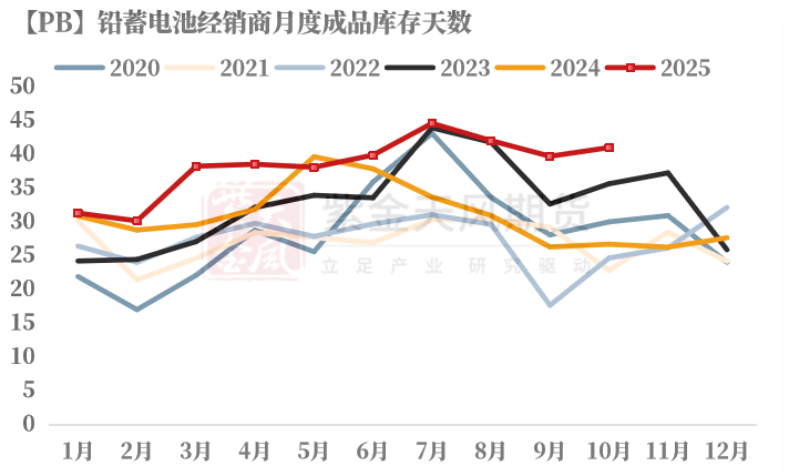 10月铅蓄电池企业成品库存24.5天,较上月增长4.8天;经销商成品库存41天,较上月增长1.3天。成品库存压力仍较大。