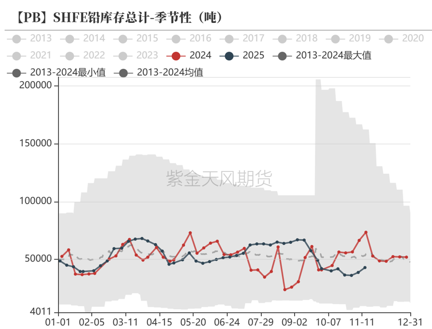 基本面来看,近期国内铅市场属于供减需增的格局。需求端,上周铅蓄电池企业开工率继续上升1.34至70.56%,近期储能大电池订单旺盛,根据我们测算,储能领域需求将贡献26年全球铅消费0.37%的增速。供应端,虽TC维持低位,但近期铅、白银价格回升带来炼厂的利润改善,原生开工率维持高位,但年尾开工呈现季节性下降;再生开工率此前大幅回升但上周再度下降2.5个百分点至48.2%,主因今年环保限制严格,另外河南等地出台对国五及以下运输车辆管控新政,限制了废电瓶到货,整体开工受限。