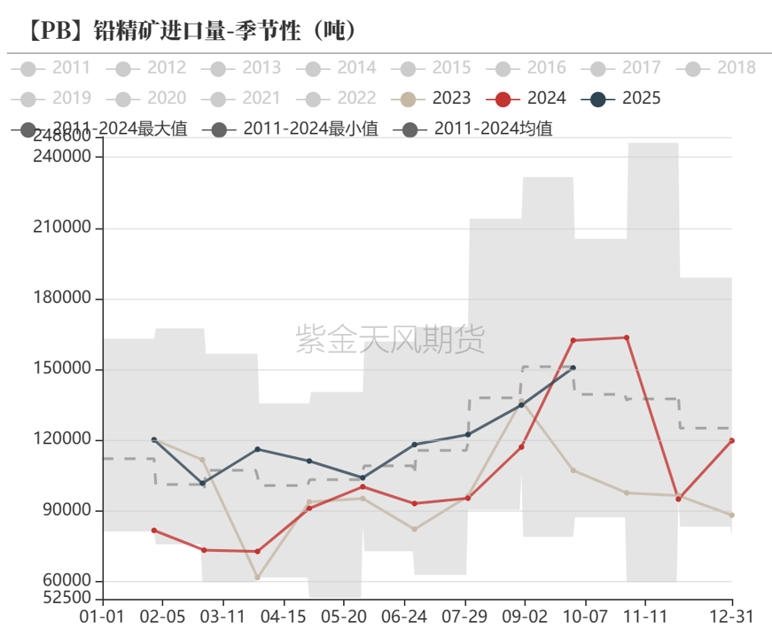 2025年9月铅矿砂及其精矿进口量为15.06万吨,环比增加11.72%,同比下降7.21%,累计进口107.83万吨,累计同比增长21.7%;