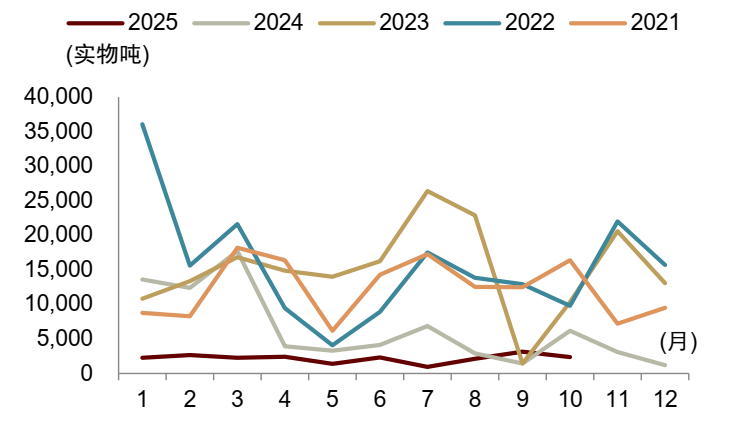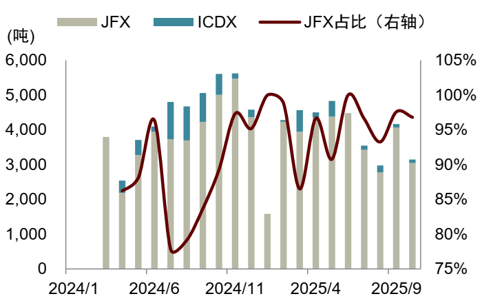 根据印尼两大期货交易所精炼锡交易数据,2024年11月以来,印尼当地代表大型冶炼厂商出口的雅加达期货交易所(JFX)精炼锡交易量占比持续维持在90%以上,且今年印尼打击当地非法锡矿开采走私以来,代表私人中小型冶炼厂的印尼商品及衍生品交易所(ICDX)曾于9月中旬-10月中旬无任何精炼锡期货交易发生。根据印尼贸易部,10月份印尼精炼锡出口量仅2643吨,同/环比-54%/-45%。