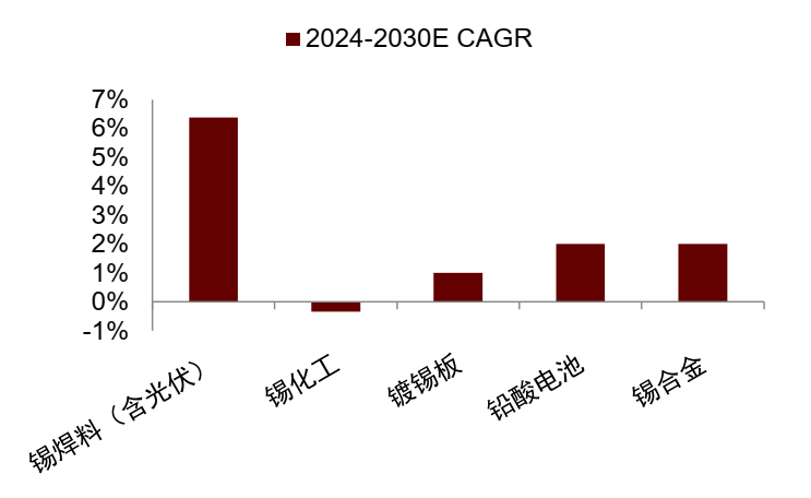 全球新增光伏装机量维持高速增长,光伏焊带用锡有望迎来系统性提升。随着全球“双碳”目标的推行以及光伏平价时代的到来,全球新增光伏装机量有望维持高速增长。我们预计,全球新增光伏装机量2024-2030年CAGR为5.3%。根据宇邦新材招股说明书,按照光伏焊带中锡基焊料占比17%,而锡基焊料主要由铅、锡等金属合成,其中锡金属占比约为62%。根据我们测算,2030年光伏焊带锡需求量为3.7万吨,2024-2030年的需求CAGR为3.8%。