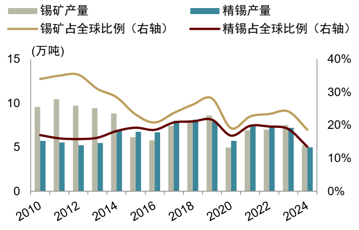 我国锡资源较为稀缺,同时行业环保标准持续提升,锡矿产量及占全球比例均出现下滑。一是国内锡资源在长期高强度开采下,储量不断下降。二是中国2024年锡资源静态储采比仅为14年,略低于全球平均水平16年,目前已探明的锡资源储备略显不足。三是2015年8月,中共中央办公厅、国务院办公厅印发《环境保护督察方案(试行)》,正式建立中央生态环境保护督察制度,并开启为期三年、20个省(区)的第一轮环保督察[1]。2019-2022年,第二轮生态环保督察分六批完成了对全国31个省(区、市)和新疆生产建设兵团、2个部门和6家中央企业的督察[2]。2023年11月,第三轮中央生态环境保护督察全面启动[3]。