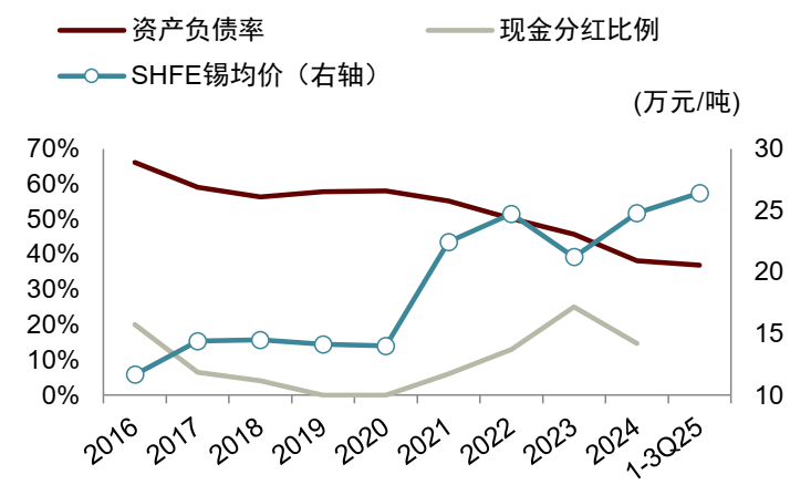图表25:锡行业现金流、资产负债率、现金分红比例及SHFE锡均价情况