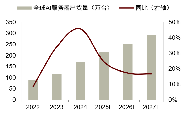 算力需求驱动AI服务器快速增长,其对高端PCB产品需求持续提升,进一步加速锡焊料需求。一是大模型对于海量数据的训练及推理所催生的算力需求,驱动AI服务器快速增长。根据Prismark数据,2024年全球AI服务器出货量172万台,同比+46%,Prismark预计2027年全球AI服务器有望达到293万台,2024-2027年CAGR为19%。