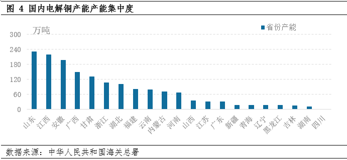在资源配置配套要求之下,未来引导产能向资源、能源优势区域转移,推动低效产能退出,培育世界一流大型铜企业集团和“专精特新”企业。所以,电解铜产能的淘汰和企业的兼并重组将是未来的另一个发展方向。从产能集中情况来看,山东、江西、安徽暂居全国前三,而后续排名很难出现明显的变动。