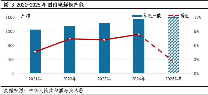 未来,铜市场需提升产业链供应链韧性和安全水平,新建矿铜冶炼项目原则上需配套相应比例的权益铜精矿产能。这一理念与资源保障的理念匹配,但是也进一步表明未来产能的扩建需要有原料的保障,因此预计未来电解铜产能的增长阻力较大,预计2025年增速将低于3%,后续增速将低于2%。