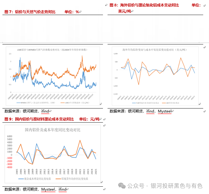 而LME铝价的上涨均伴随着成本的显著上涨。从电解铝的冶炼成本来看,氧化铝及能源成本占总成本的70%左右。考虑历史数据连续性问题,我们使用海外天然气价格来作为海外能源价格波动情况的参考,发现在2006年、2008年及2021-2022年伦铝价格的冲高均伴随着能源成本的上涨,而从氧化铝价格来看,2006年LME年均价同比上涨的694美元中,有492美元是氧化铝价格上涨贡献的,占铝价上涨值的70%。2021年沪铝年均价同比上涨的4709元中,有2323元是氧化铝、煤炭及阳极等主要原料成本的上涨贡献的(占铝价上涨值的49%)。