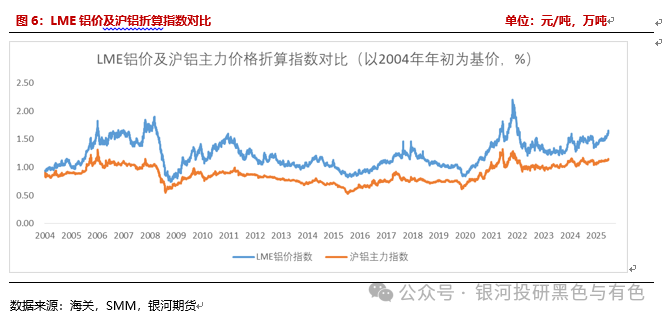 我们对比2004年以来伦铝和沪铝的价格走势不难发现,沪铝在2006年及2021年两次触及24000元/吨附近时,内外价差均有所走扩,沪被动跟涨LME铝价为主。
