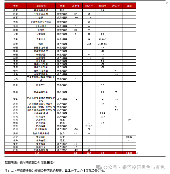 2018年初工业和信息化部发布《关于电解铝企业通过兼并重组等方式实施产能置换 有关事项的通知》(工信部原〔2018〕12号)以来,电解铝产能的净增以产能置换进行。近年来国内电解铝产能开工率持续提高,截至2025年10月,中国电解铝建成产能4523.2万吨,运行产能4443.40 万吨,开工率达98.24%。而2026年,预计我国电解铝产能净增为72万吨,其中包括内蒙霍煤鸿骏净增的35万吨、豫港龙泉铝业公司计划置换但目前未开满的8万吨、山西华阳铝业置换山西阳泉铝业已拆除的6.9万吨、天山铝业20 万吨电解铝富余指标20万吨等。其余产能变动均是置换为主,部分企业为降低电耗等指标、积极响应政策引导,更换电解槽、进行技术改造,向国家要求的目标电耗指标靠拢。而2027年,企业目前公示的产能变动均是等量置换,并没有产能净增。我们核算2026年及2027年我国电解铝产量分别为4475万吨及4489万吨,产量增量为75万吨及14万吨,增速为1.7%及0.31%。由于我国电解铝产量占全球的近60%,2027年我国电解铝产量增速的骤降带动全球电解铝增速显著下滑。而据不完全统计,目前闲置的电解铝产能亦仅剩50余万吨。
