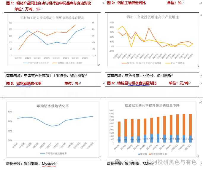 我们将中国有色金属加工工业协会历年公布的铝加工材产量(剔除铝箔坯料后)与铝表观需求的进行对比,表观需求较铝加工材产量高的部分在本文视作“产业中间环节周转库存”,该库存与铝加工产能的变化具有较强的相关性。铝加工企业产能扩张的过程中,由于铝加工企业投资增速高于产量增速,其新投产能的备货需求带动中间环节库存增加。此外,铝水就地转化率的持续提高也是中间品库存扩大的原因之一。而在铝加工企业技术升级的过程中,叠加铝水就地转化率的提升,产业链降碳耗的需求,铝加工环节产能的扩张在2024年至今年,以及未来仍将持续进行。则在扩张趋势中,中间品环节周转库存仍会带动铝表观需求高于实际需求,使得铝需求的表现好于市场预期。