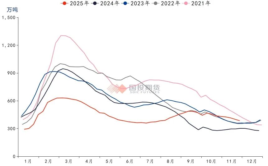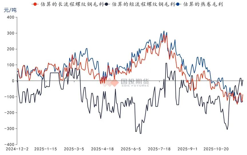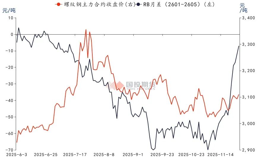 并不是所有“反内卷”品种11月都有靓丽的表现,比如,焦煤在所有品种中跌幅都是居前的,单月下跌了17%左右。在焦煤和焦炭持续下跌时,铁矿和螺纹表现出一定抗跌的韧性,所以商品之间的分化并不局限于不同板块之间,在同一产业链中也会因为品种自身供需节奏不一而出现分化。焦煤大跌的主要逻辑来自供应端,因进口激增带来的供应压力,相比而言,螺纹和铁矿并没有这种压力。对于需求端,市场逐渐意识到下游地产复苏可能是一个较漫长的过程,随着盘面的持续下跌,亦在逐渐消化需求端带来的利空,所以当价格跌到一定位置时,市场对需求端的变动有些钝化。近期,螺纹期货盘面反而关注的是,在库存下降和行业利润不佳下的交割逻辑(图4和图5),体现为螺纹2601与2605这两个合约的月间价差持续走强(图6),从之前的-70左右缩小至-10左右。