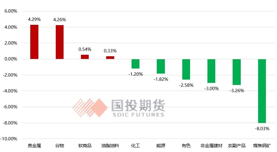 其他板块多数以下跌为主,跌幅居前的主要是煤焦钢矿和农副产品板块,其中煤焦钢矿以 -8%的跌幅领跌,反映出黑色系产业链需求端的持续承压,叠加产能释放节奏的影响,弱势格局尚未出现扭转信号。