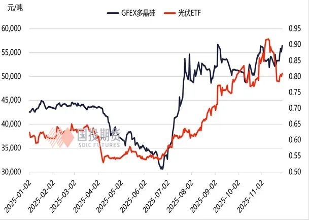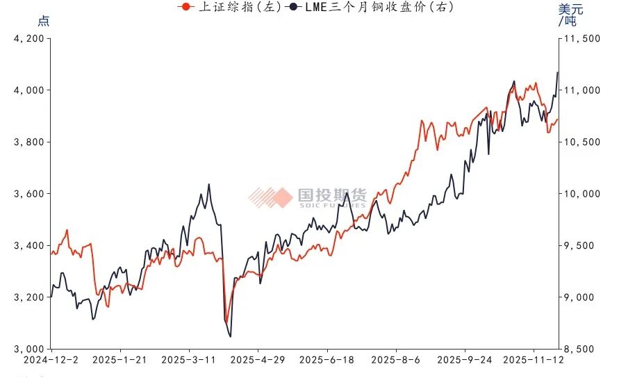 贵金属持续走强拉宽了金铜比,从而在估值上给铜等有色带来提振。不过,除此之外,新旧能源转型在其他领域给铜带来的新需求增长,也从基本面给铜很强支撑,这些因素叠加,是近两年来铜始终在历史高位保持坚挺的主要原因。新旧能源转型还让市场看到新能源金属(碳酸锂、多晶硅和工业硅)未来的需求增长点,碳酸锂和多晶硅都出现期货市场和股票市场共振的局面(图2)。虽然现在还没有看到这些品种从过剩转为紧平衡的迹象,但在反内卷的提振下,市场貌似意识到,今年6月份的低点可能就是近些年的低点。从交易角度来说,往上的收益风险比可能更优。未来市场可能还将围绕这一主题展开,即AI带来算力需求,算力需要大量的电力,从而会加快新旧能源转型,因此,除了新能源金属出现期货市场和股票市场共振之外,年内多数时间还可以观察到,铜的单边绝对价格与上证指数具有高度的趋同性(图3)。