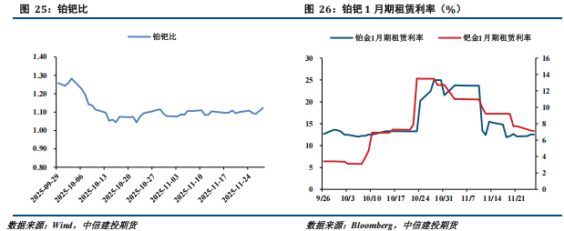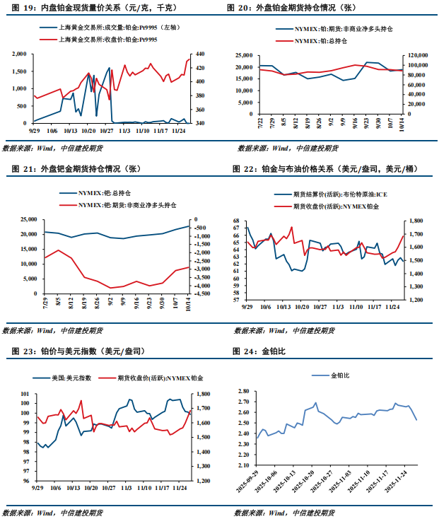 上周降息预期进一步走强,市场流动性担忧减弱。纽约联储主席威廉姆斯的偏鸽发言扭转市场对于联储的决策预期,同时上周发布的美国经济数据显示温和通胀与就业压力,更为 12 月降息提供数据支撑,金融属性驱动贵金属板块上行。广期所铂钯期货上市也上调全球投资者对于铂钯的预期,吸引部分资金关注并推动内外盘价格上行。