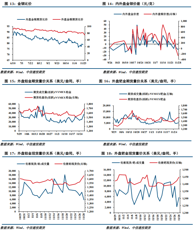 国内方面,11 月 27 日广期所上市铂钯期货,为铂钯的全球定价增添亚洲版图,吸引了全球贵金属投资者关注。铂钯期货运行首周走势温和,首日冲高后温和回落,总体走势平稳。本次期货上市为国内投资者提供新的价格管理工具与投资工具,且创造内外盘套利机会,大量吸引投机资金与产业资金,助推了上周铂钯板块行情。