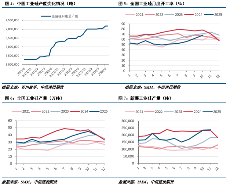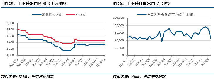 10月工业硅出口转向疲软。海关数据显示,2025年10月工业硅出口量4.51万吨,环比减少36%,同比减少31%。2025年1-10月份工业硅累计出口量60.67万吨,同比减少1%。