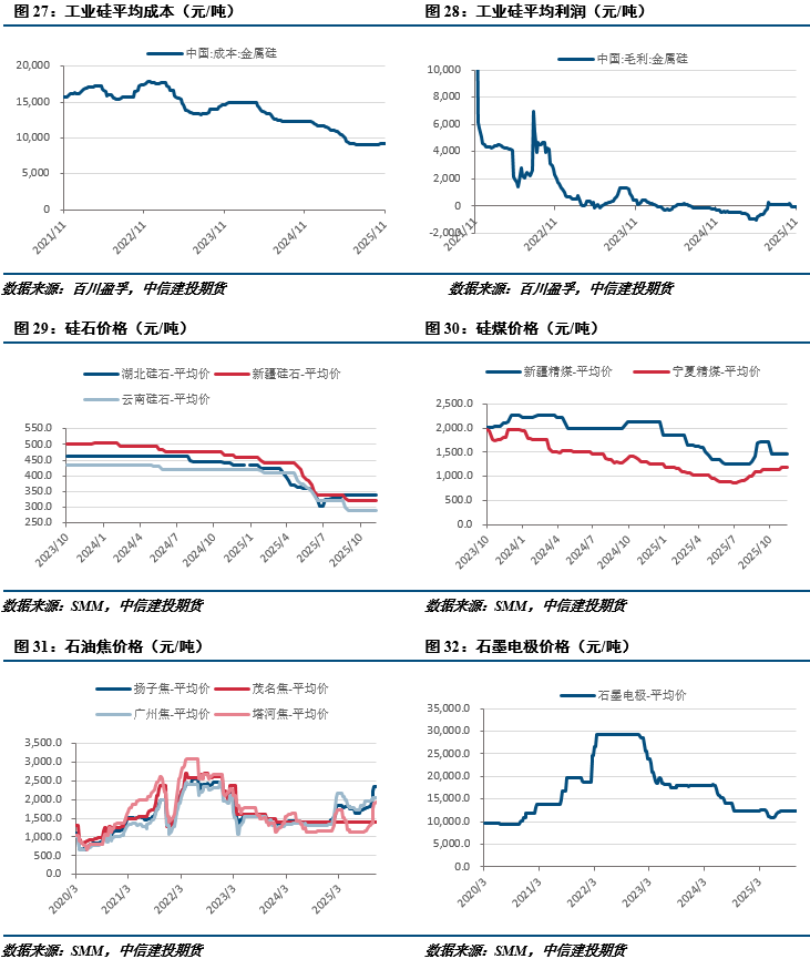 工业硅生产成本趋稳,还原剂方面石油焦价格略有走弱,其余还原剂相对平稳,西南枯水期到来电价将进一步上调,将影响未来一段时间西南成本。利润方面,近期工业硅价格与成本相对平稳,工业硅生产利润维持低位。