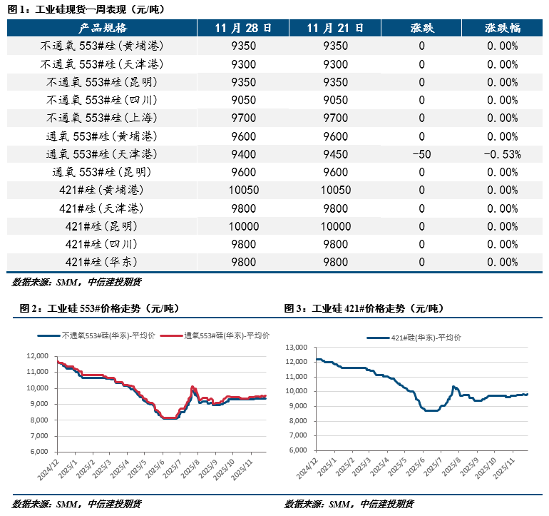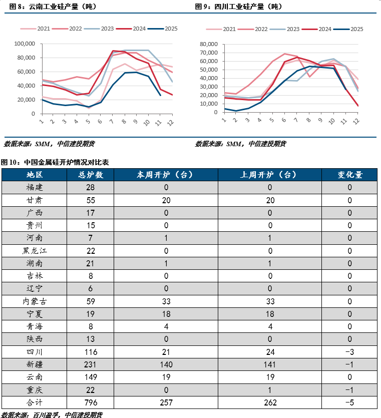 上周工业硅期货小幅上涨,市场情绪趋稳,供应减少给予工业硅底部支撑。供需方面近期相对平稳,西南枯水期到来厂家持续减产,北方开工平稳但未来仍有环保不确定性,需求端整体偏弱,多晶硅、有机硅在反内卷之下均有减产行动。总体来看,近期工业硅供需两弱,但月度供需整体趋于平衡,市场多空博弈减弱,工业硅行情波动或有限。