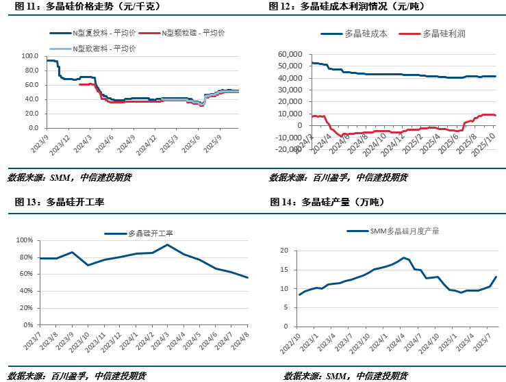 需求情况:上周多晶硅价格持续稳定,下游需求弱势但上游挺价意愿强烈,多晶硅企业逐渐减产,后市产量或趋下降;有机硅持续挺价,行业拟开启自律减产,有机硅对工业硅需求支撑有限;铝合金行业相对平稳,对工业硅维持刚需;工业硅10月出口转向疲软。成本利润:工业硅生产成本趋稳,还原剂方面石油焦价格略有走弱,其余还原剂相对平稳,西南枯水期到来电价将进一步上调,将影响未来一段时间西南成本。