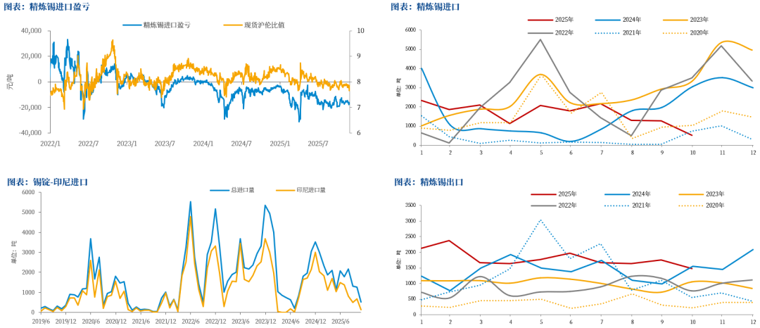 10月精炼锡进口量约为526吨,环比减少743吨,出口量约为1480吨,环比减少268吨,11月沪伦比值整体有所回落,叠加印尼出口受限,预计后续进口量难有明显恢复;