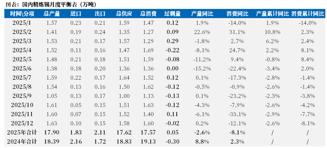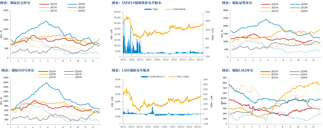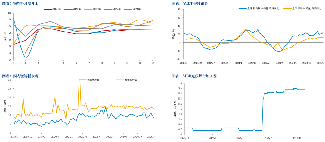 需求:截至目前,国内精炼锡消费持续低迷,而屡创新高的锡价显著抑制下游接货意愿,终端领域仅半导体板块对消费有所支撑,光伏及消费电子领域持续走弱。
