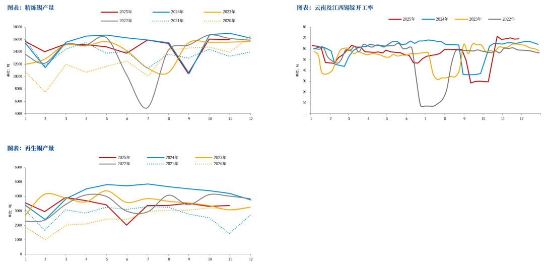 供应:近日,市场传言M23武装阻断刚果(金)Bisie锡矿的运输路线使得该矿生产中断,然而该消息并不符实,事实上该座矿山仍处于正常生产状态,并未出现减停产现象。后续仍需关注刚果(金)军事冲突进程,若战事持续升级并扩大范围,则锡矿潜在的供应或有一定影响。另外,整体上伴随缅甸矿山复产进度不及预期,进口矿供应仍相对有限。精炼端,11月云南及江西开工率环比有所维持,产量持续处于高位;而进口端受印尼出口低位的影响,我国进口量环比显著下滑。供应端整体依然偏紧。