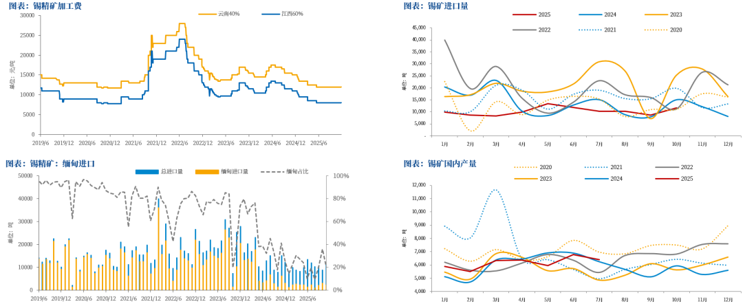 锡精矿加工费维持于较低水平,云南、江西分别为12000元/吨、8000元/吨,该价格已维持半年,短期矿端供应依然难见恢复;