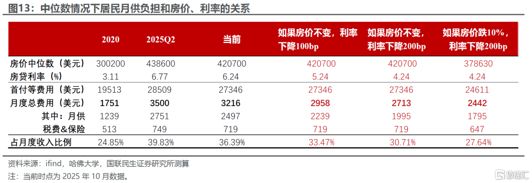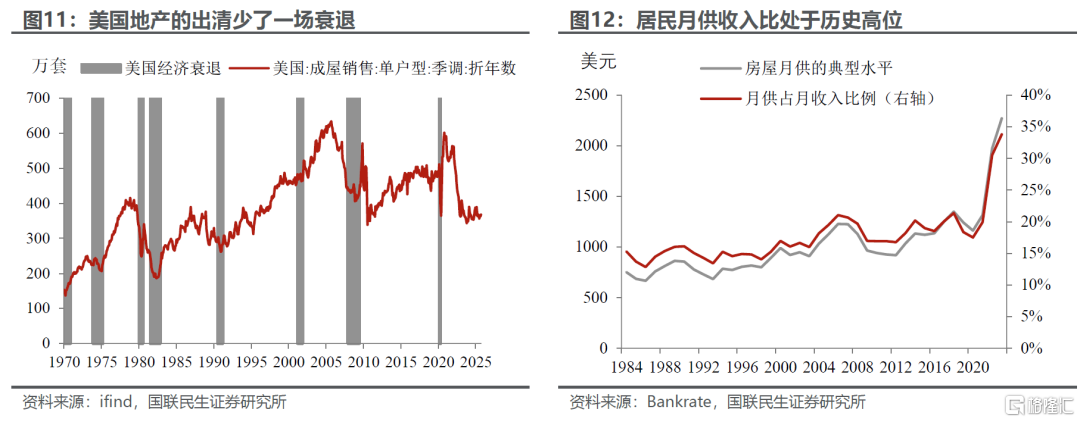 本轮美国地产最大的问题在于,地产下行周期(房屋销售下行)内房价反而大幅上涨。因此,“高利率+高房价”的反常组合,使得美国居民月供压力处于历史高位、地产的需求被压制,而房价上涨既有结构性不足的原因,也有成本上升(比如关税)的因素。